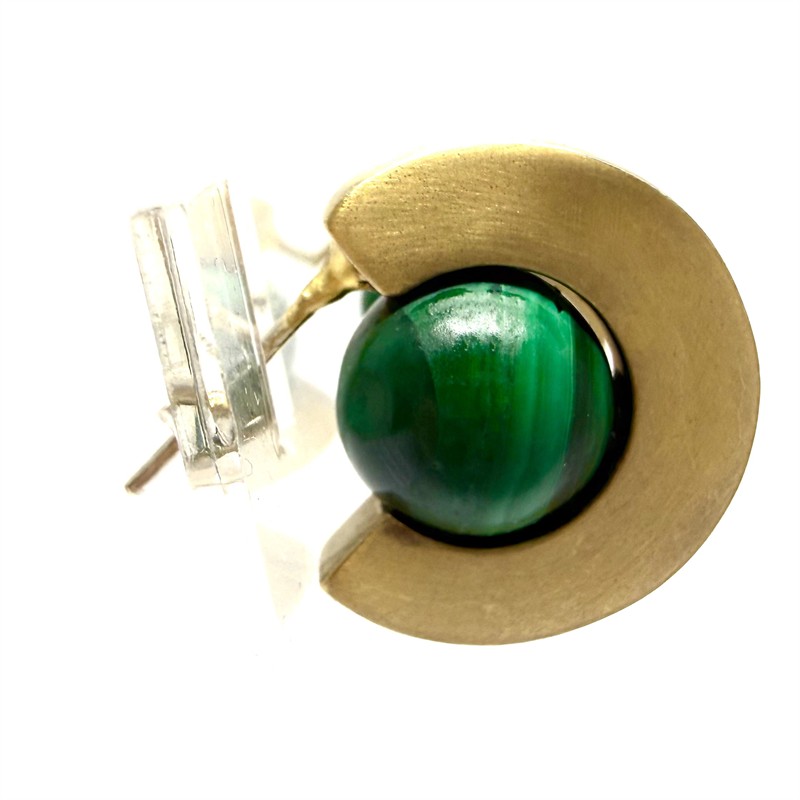 Originální náušnice ze zlaceného stříbra zdobené malachytovou kuličkou. Náušnice byly zhotoveny ze stříbra sterlingové ryzosti (925/1000), o celkové váze 8,28 g. Průměr 1,9 cm. Povrch zdoben jemným matováním. Vyčištěno zlatníkem, výborný stav.