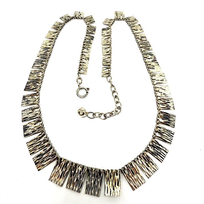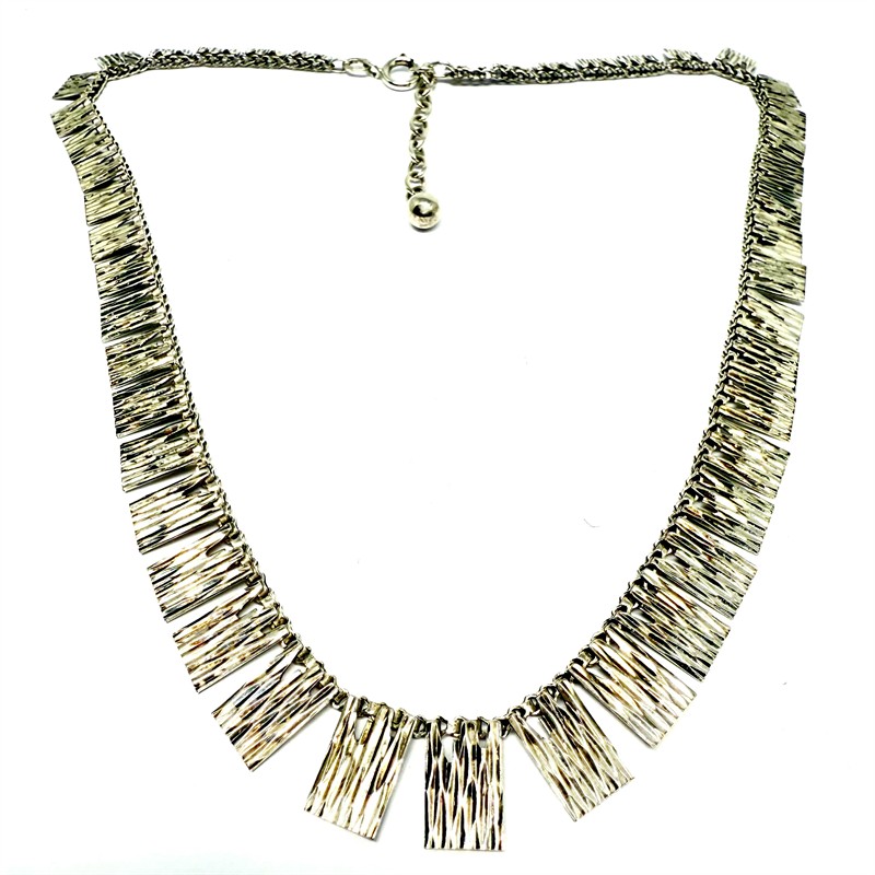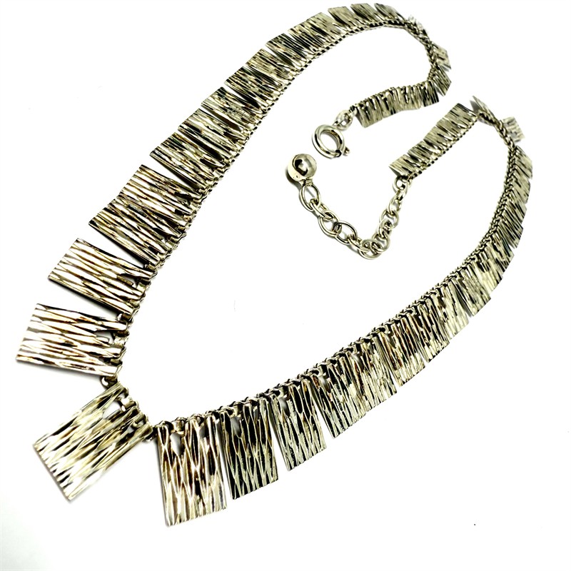 Efektní, originální stříbrný náhrdelník ze 70. let. Šperk tvoří velké množství obdelníkových článků s výrazně strukturovaným povrchem. Šperk byl zhotoven ze stříbra ryzosti 835/1000, o váze 19,72 g. Délka 42 plus 5 cm. Značeno autorskou, ryzostní a puncovní značkou. Perfektní stav.