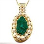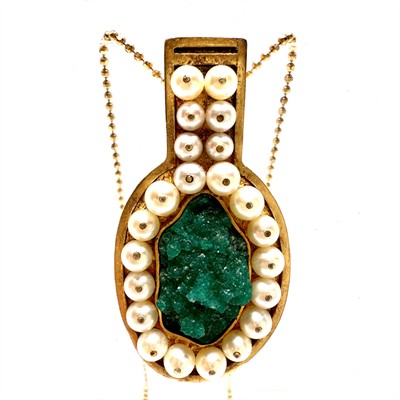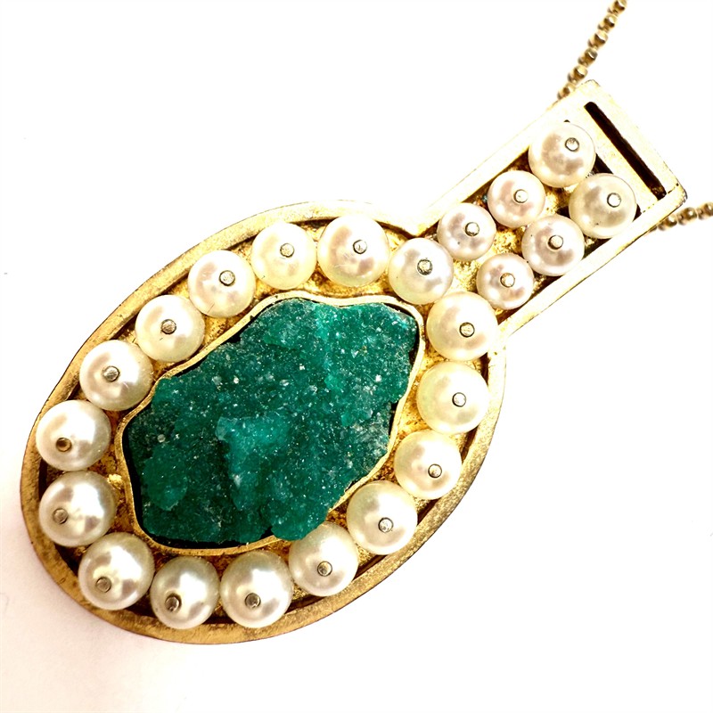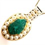 Originální náhrdelník - kuličkový řetízek s větším, odnímatelným závěsem. Šperk zhotovený ze silně zlaceného stříbra ryzosti 925/1000 zdobí sytě zelený dioptas orámovaný bílými perlami. Celková váha 12,92 g. Délka řetízku 45 cm. Rozměry závěsu 4 x 2 cm. Originální, výrazný šperk v perfektním stavu.