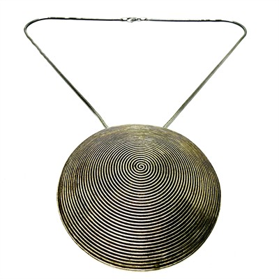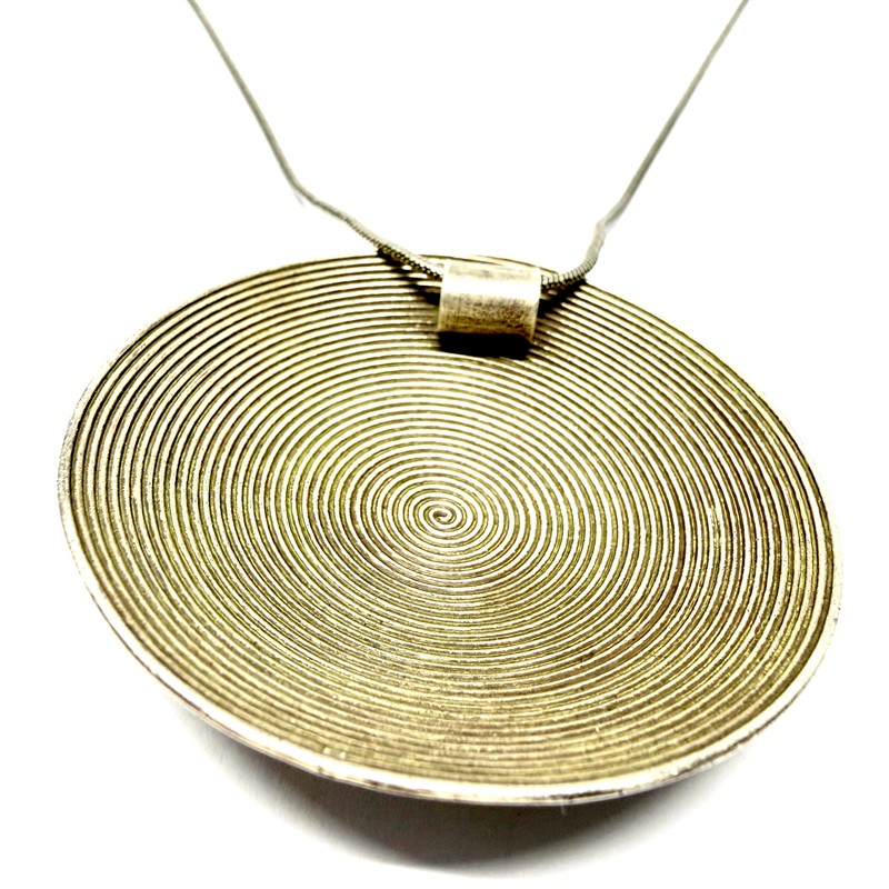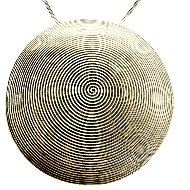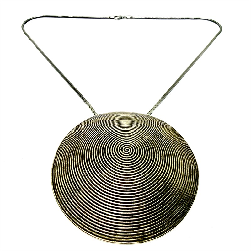 Nevšední stříbrný náhrdelník s grandiozním, odnímatelným závěsem. Šperk byl zhotoven ze sterlingového stříbra (925/1000) o celkové váze 32,53 g. Délka řetízku 46 cm, průměr závěsu 6 cm. Perfektní stav.