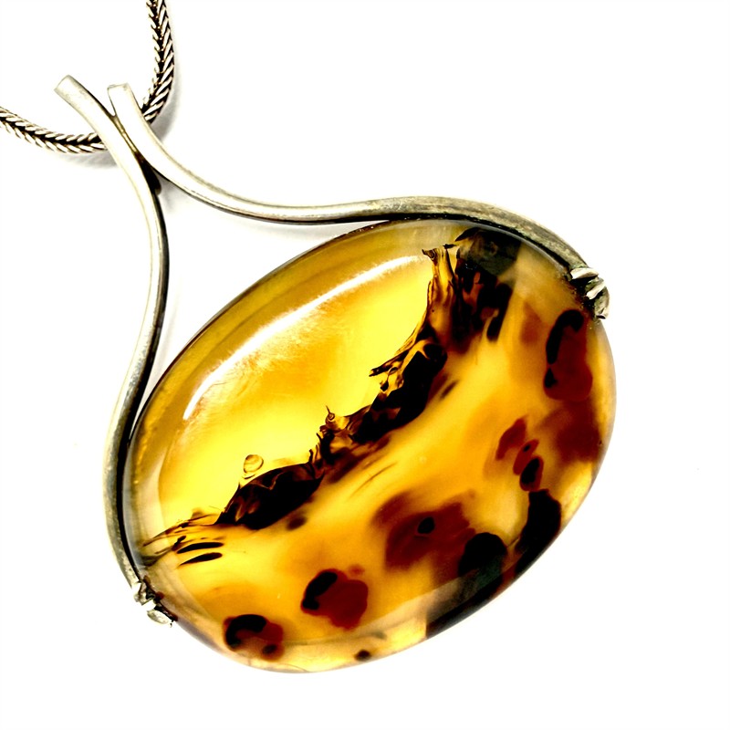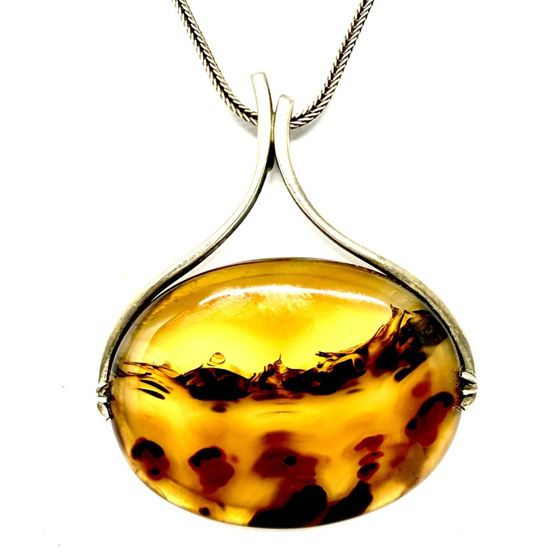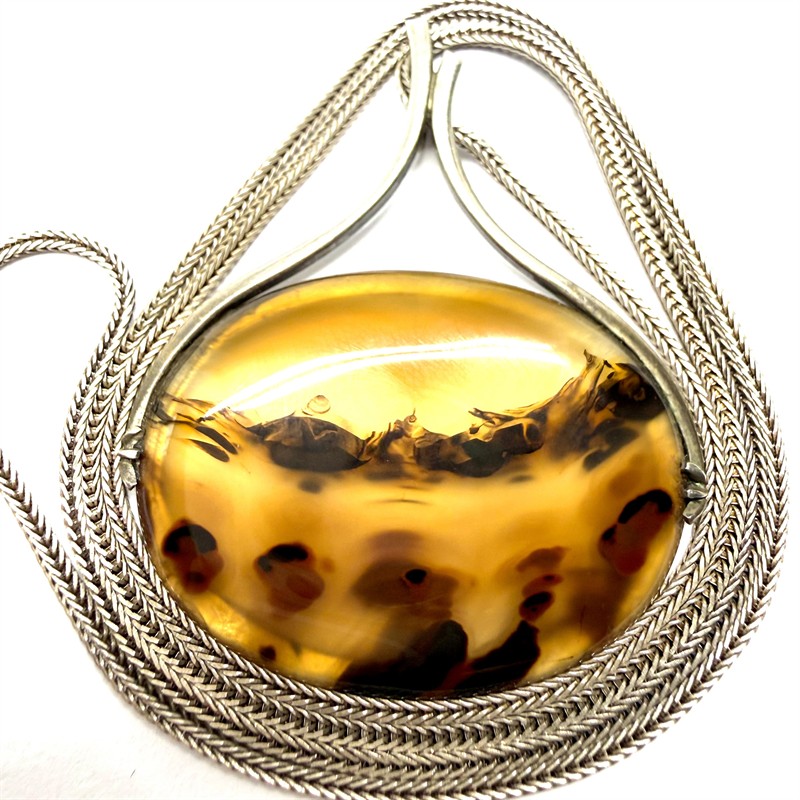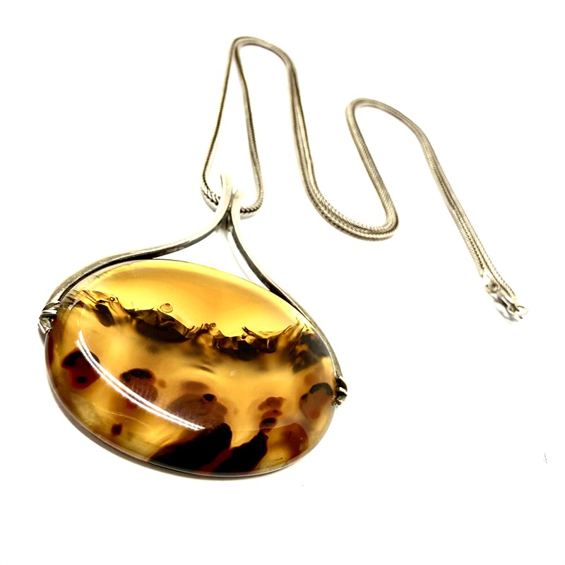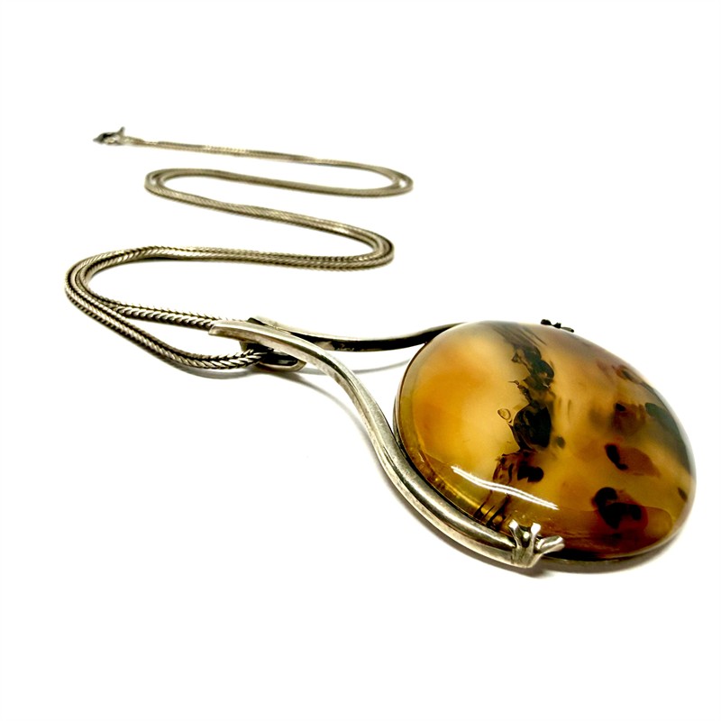 Originální, stříbrný náhrdelník. Hladký, splétaný řetízek o délce 62 cm zdobí odnímatelný, nadčasový závěs. Tomu vévodí velký krajinný achát se zajímavou kresbou. Závěs byl zhotoven ze stříbra ryzosti 800/1000, řetízek stříbro ryzosti 900/1000. Celková váha 18,35 g. Rozměry závěsu 5 x 4,4 cm. Značeno autorskou, ryzostní a puncovní značkou. Perfektní stav.