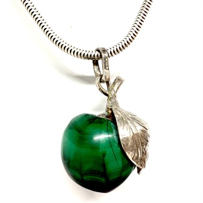Půvabný stříbrný náhrdelník - masivní hladký řetízek s odnímatelným závěsem věrně znázorňujícím jablko. Zhotoveno z malachitu a stříbra ryzosti 800/1000. Drahý kámen má sytý zelený odstín a krásnou kresbu. Řetízek délky 50 cm byl vyroben ze sterlingového stříbra (925/1000). Celková váha šperku 30,90 g. Nevšední, autorský šperk ve výborném stavu.