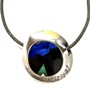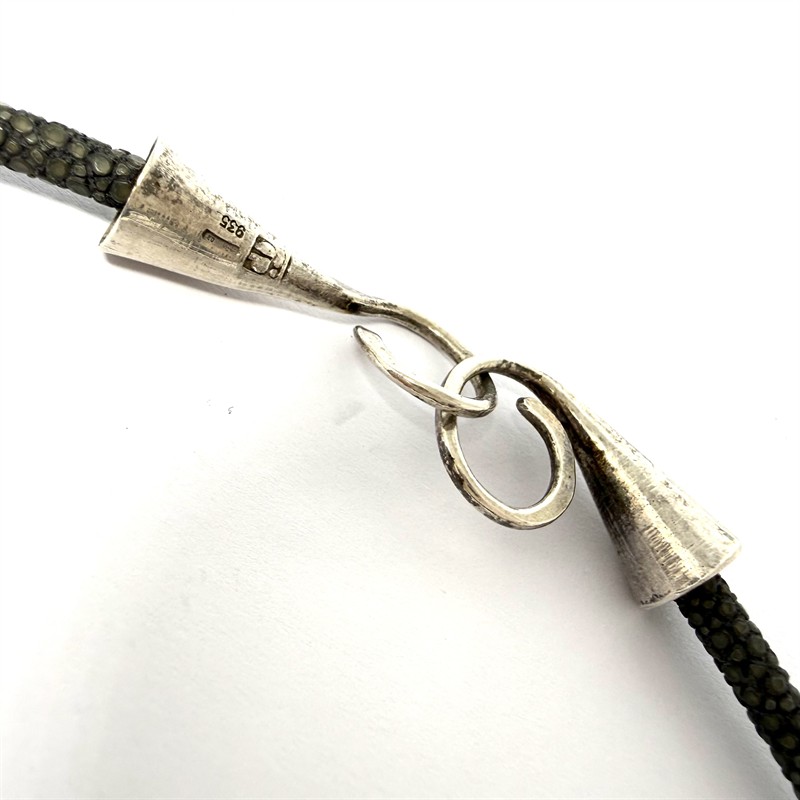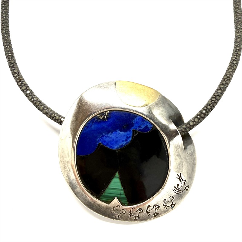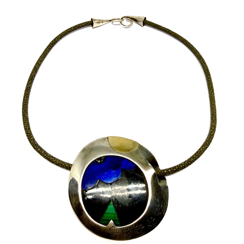 Originální, autorský náhrdelník s výrazným, velkým, kulatým ověsem. Šperk tvoří šedá kůže z rejnoka na místě řetízku a velký závěs zdobený abstraktní mozaikou z drahých kamenů. Stříbro ryzosti 925/1000, váha 43,11 g. Průměr závěsu 6 cm, délka náhrdelníku 48 cm. Výrazný, osobitý šperk.