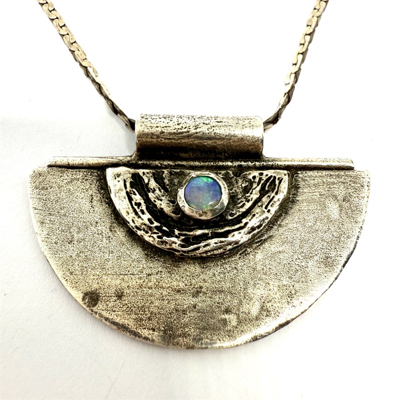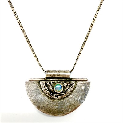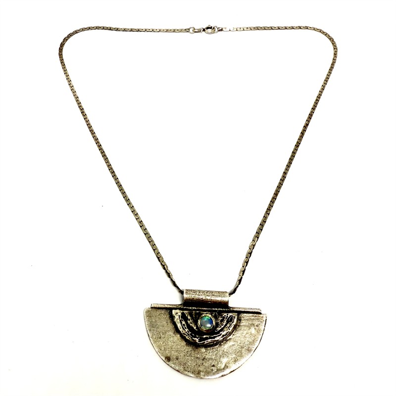 Originální, náhrdelník ze stříbra. Šperk skládající se z řetízku a odnímatelného závěsu. Ten zdobí krásně zbarvený opál s modrým nádechem. Řetízek ze stříbra ryzosti 925/1000, závěs stříbro 835/1000. Celková váha 13,99 g. Délka řetízku 43 cm, rozměry závěsu 4 x 2,5cm. Výborný stav.