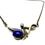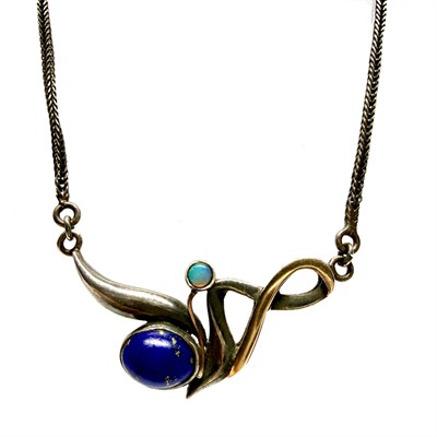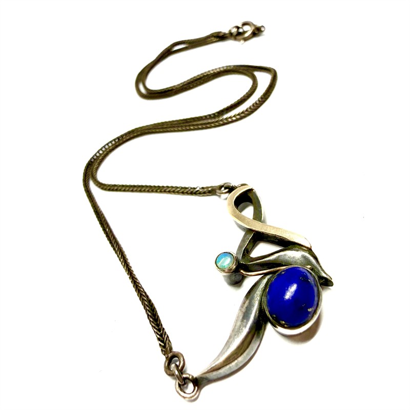Půvabný, originální, stříbrný náhrdelník. Ateliérový náhrdelník byl zhotoven v kombinaci sterlingového stříbra (925/1000) a zlata ryzosti 333/1000. Šperk je osazen tmavě modrým lápisem lazuli a drobným opálem výrazného modrého odstínu. Povrch zdoben tmavým rhuteniem. Celková váha náhrdelníku 6,25 g. Délka 40 cm. Výborný stav.