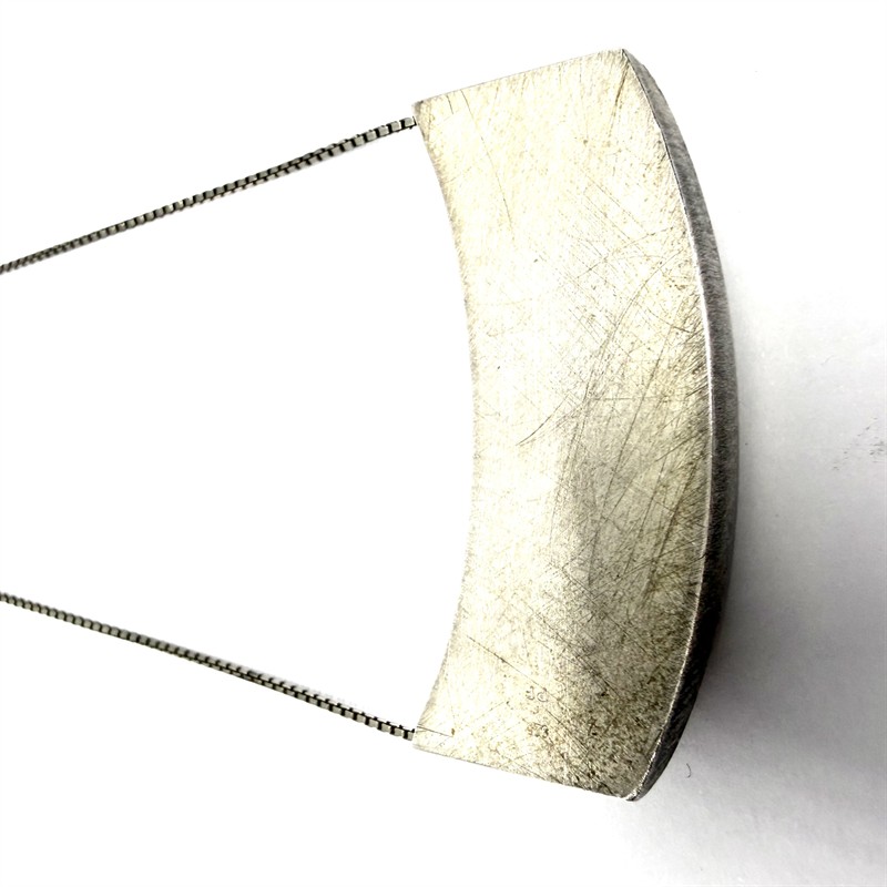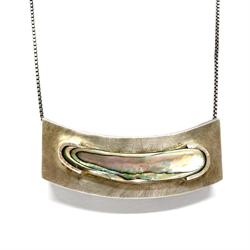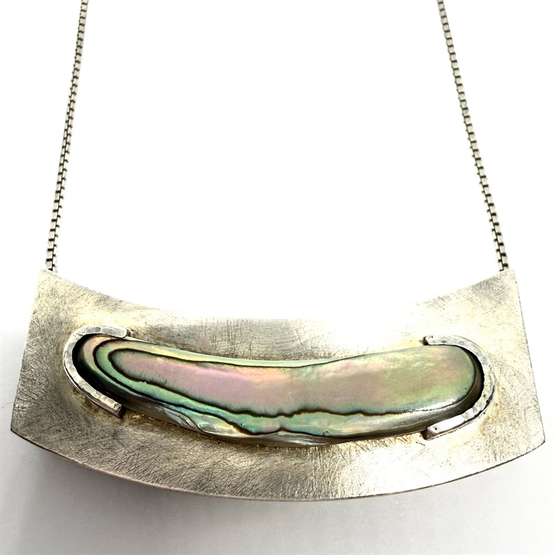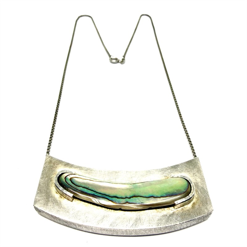 Originální, stříbrný náhrdelník - řetízek s velkým, odnímatelným závěsem. Ten zdobí perleťovina půvabného zeleného odstínu. Povrch jemně matován. Sterlingové stříbro (925/1000), celková váha 34,83 g. Délka řetízku 46,5 cm. Rozměry závěsu cca 6 x 2 cm.
