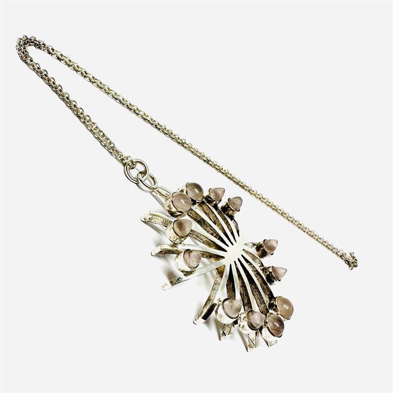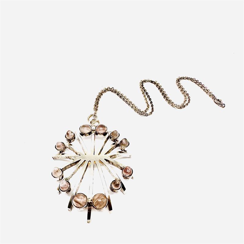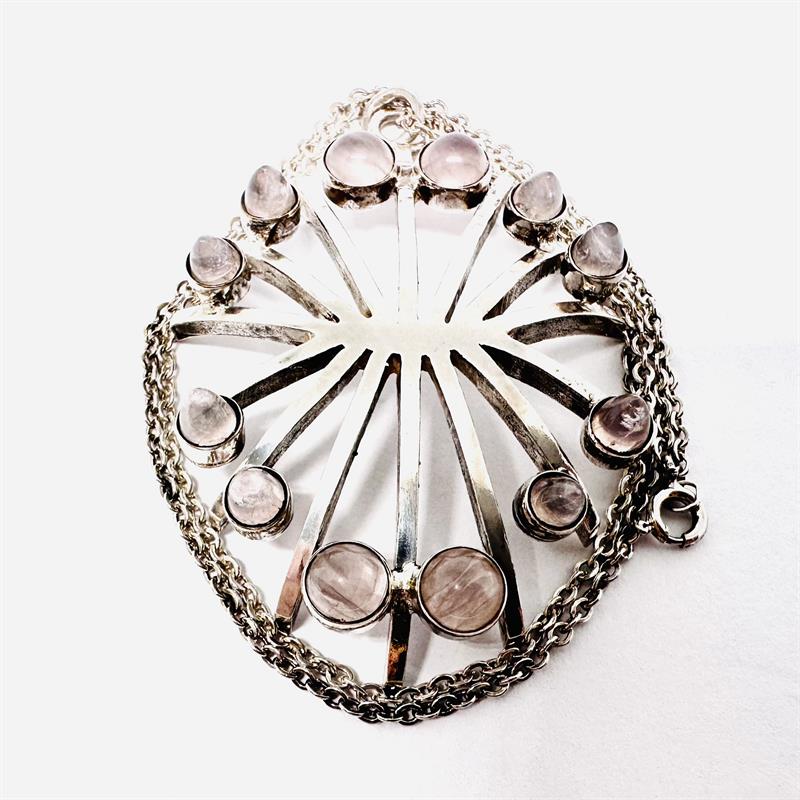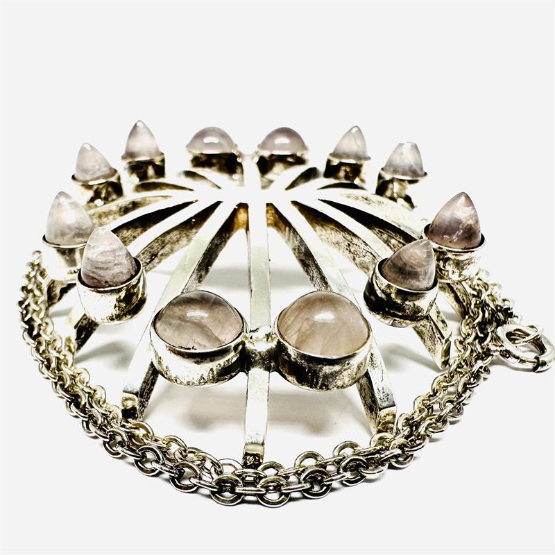 Stříbrný náhrdelník s velmi nevšedním odnímatelným závěsem. Šperk byl vyroben ze stříbra ryzosti 830/1000. Zdobí jej 12 růženínů, hladkého kulatého brusu kabošon, 8 z nich je kónicky vybroušených. Závěs je větší, rozměry 7 x 4,5 cm. Řetízek délkám 48 cm byl vyroben ze stříbra ryzosti 48 cm. Nevšední, designový šperk v perfektním stavu.