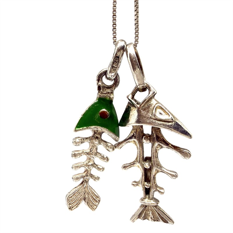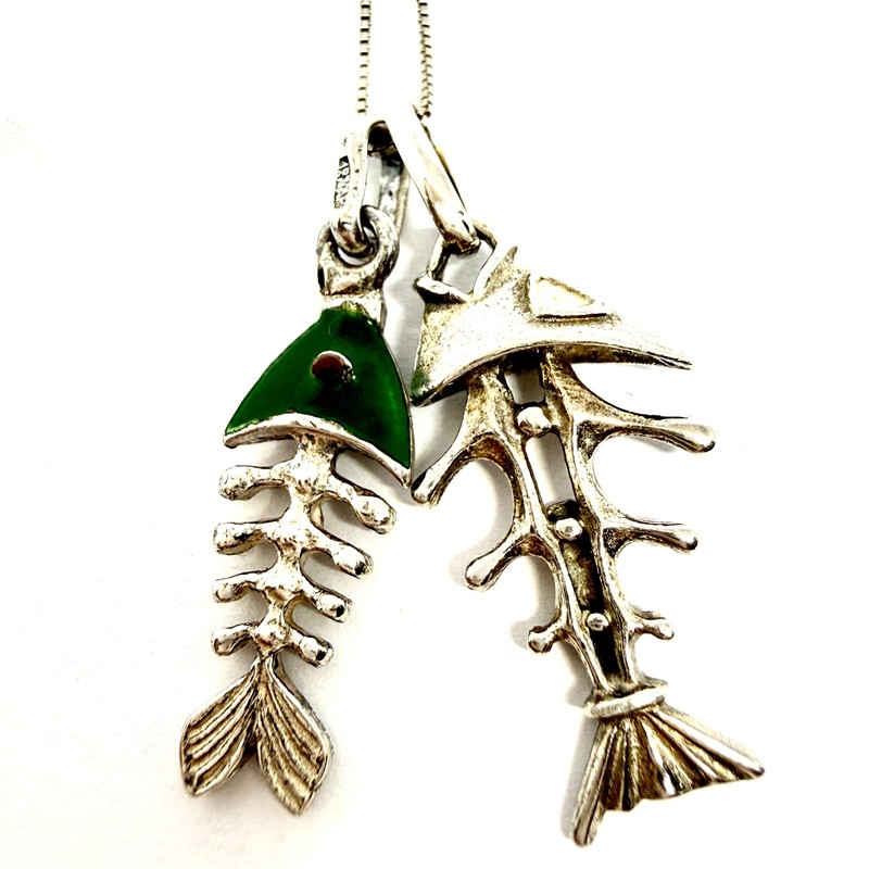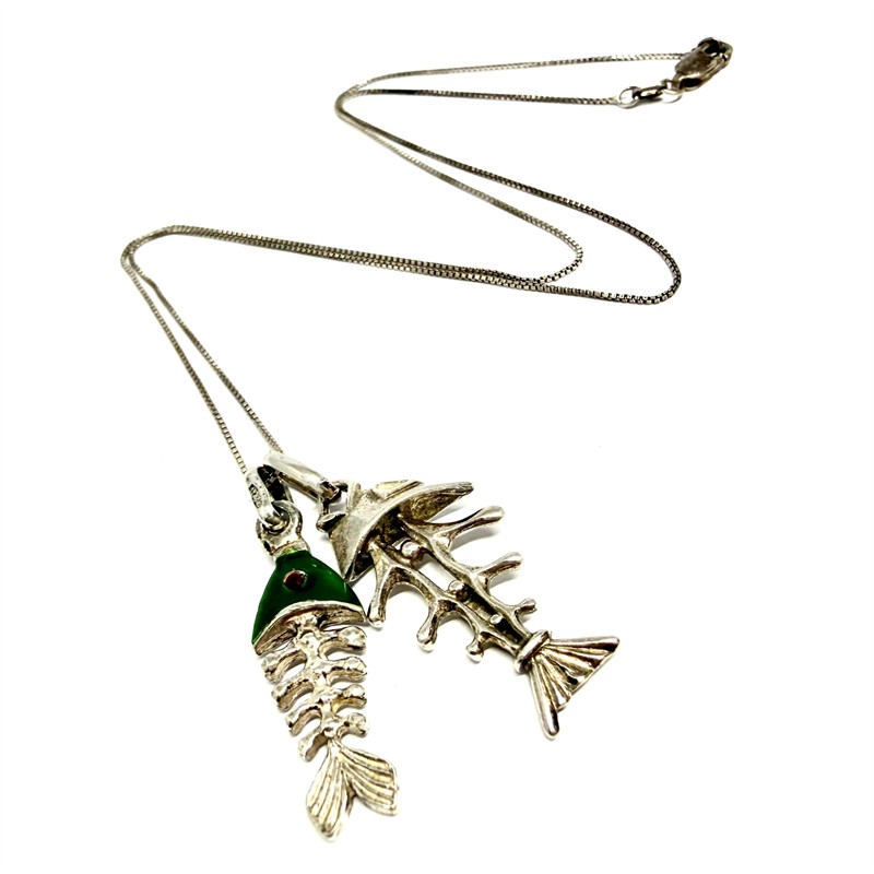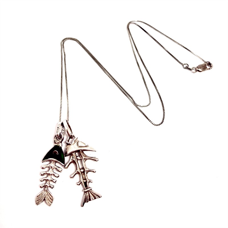 Nevšední, stříbrný náhrdelník zdobený dvěma odnímatelnými závěsy - skelety ryb. Šperk byl zhotoven ze stříbra sterlingové ryzosti (925/1000), o celkové váze 6,58 g. Délka řetízku 45 cm, délka závěsů 3,5 a 3 cm. Výborný stav.