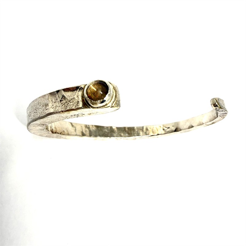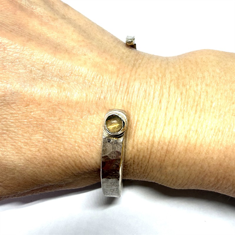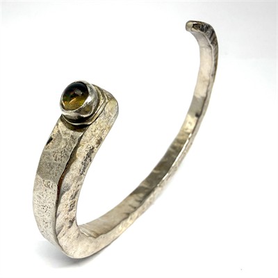 Velmi nevšední stříbrný náramek. Šperk byl zhotoven ze stříbra sterlingové ryzosti 925/1000 a váží 39,84 g. Celý povrch je zdoben výrazným tepáním. Šperk je osazen kulatým etiopským opálem. Průměr 6 cm. Náramek je vhodný spíše na subtilnější zápěstí. Profesionálně vyčištěno. Perfektní stav.
