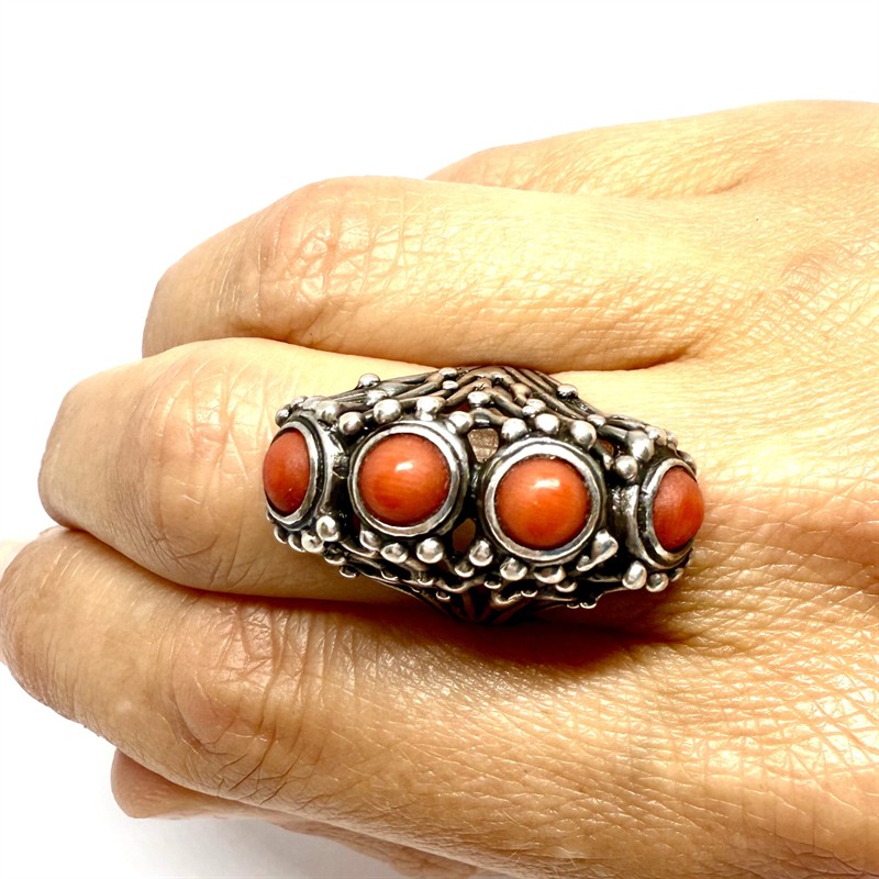 Nevšední, velmi půvabný stříbrný prsten znároznující korál, ozdobený čtyřmi středomořskými, červenými korály. Velikost 54. Originální šperk v perfektním stavu.