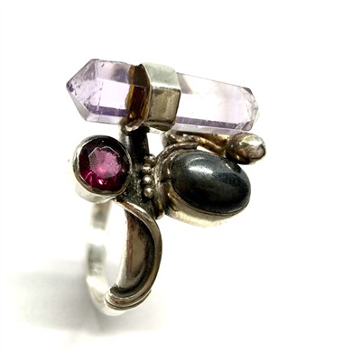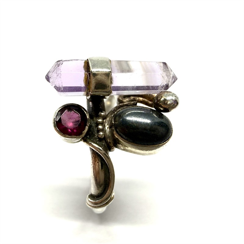 Nevšední, půvabný, stříbrný prsten. Šperk zdobí krystal světle fialového ametystu, kontrastně dozdobený hematitem a drobným almandinem. Drahé kameny jsou přírodního původu. Prsten byl zhotoven ze sterlingového stříbra (925/1000), o celkové váze 3,10 g. Velikost 55. Výborný stav.