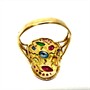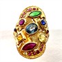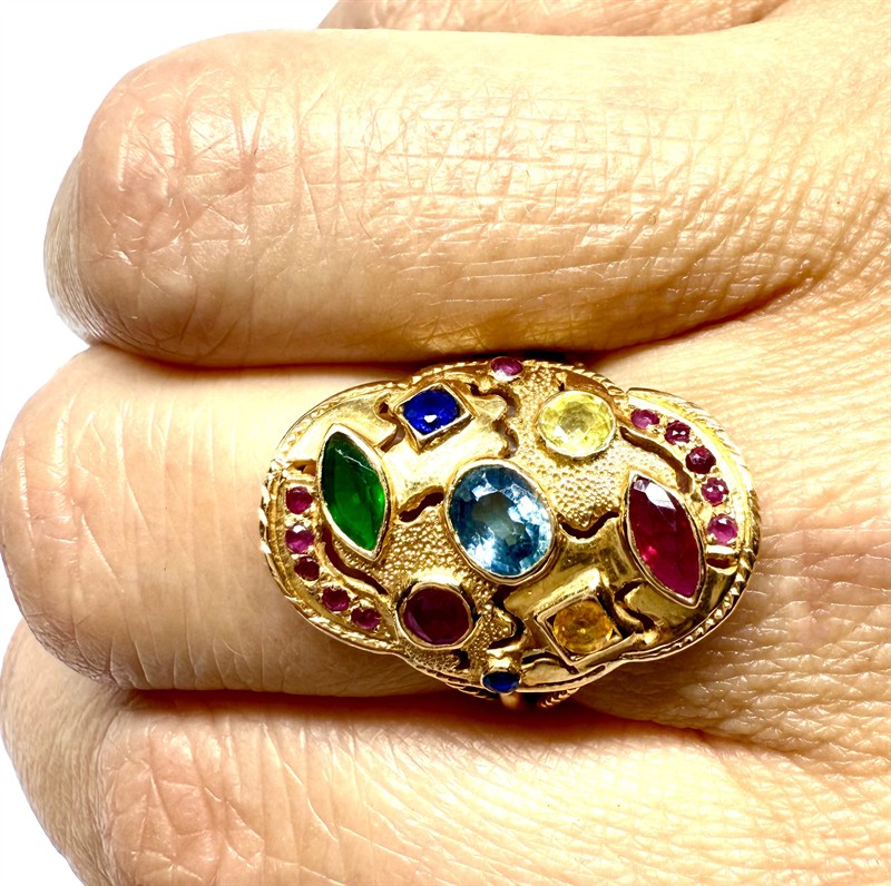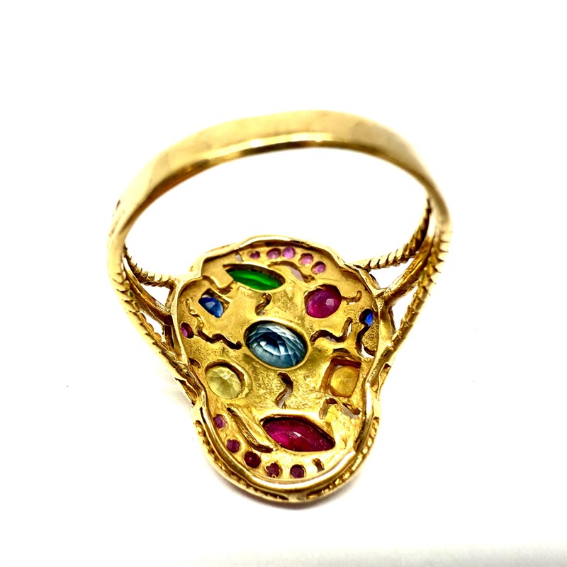 Nevšední prsten z 18ti karátového zlata (750/1000) zdobený drahými kameny. Jedná se rubíny, safíry, citríny a turmalín. Drahé kameny jsou přírodního původu. Celková váha prstenu 4,20 g. Velikost 53. Ojedinělý, velmi příjemně nositelný šperk vynikající vysokou kvalitou užitých materiálů i zpracování v perfektním stavu.