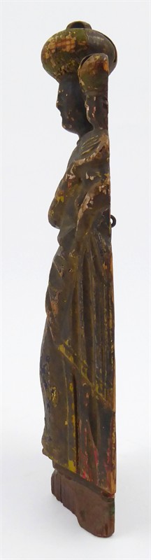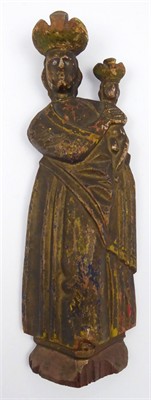 Dřevořezba. Přiloženo osvědčení Národního památkového ústavu České republiky. Dřevořezba špalíčkového typu Panny Marie Svatohorské s malým Ježíškem v náručí respektující všechny ustálené kompoziční znaky. Oba jsou korunováni. Madona stojí na nízkém trojúhelníkovém podstavci s čelní hranou v ose řezby. Zadní strana plochá. Téměř zcela setřelá polychromie propůjčuje této dřevořezbě velmi zajímavou patinu. Čechy, třetí třetina 19. století. Výška 22 cm.