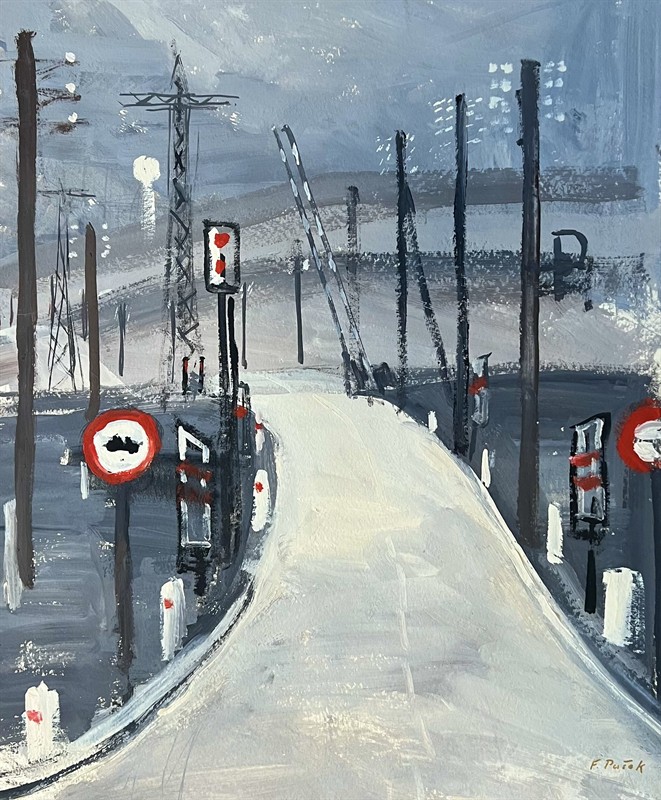 F. Pašek (*1922) - Železniční přejezd, kombinovaná technika, rozměr 50 x 60 cm (65 x 75), rámováno v krásném slohovém rámu, signováno. Akademický výtvarník, sochař a restaurátor, studia na VŠUP u profesorů Otto Eckerta a Jana Kavana. Řada jeho děl byla realizována v architektuře - Kalich metro Želivského, Čápi park u České televize, dále barokní faksimile metro Malostranská a pro zahradu zámku v Tróji. Věnoval se také tvorbě malířské, kde byl např. inspirován motivem městských a industriálních krajin s vystižením atmosféry výtvarného díla. Působil jako profesor na pražské Akademii a byl členem komise Mánesa.