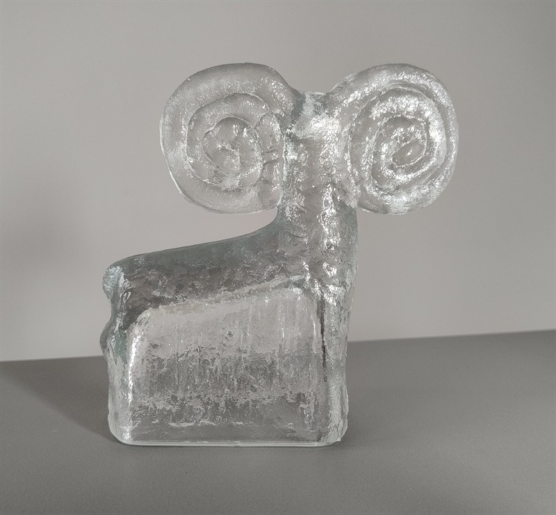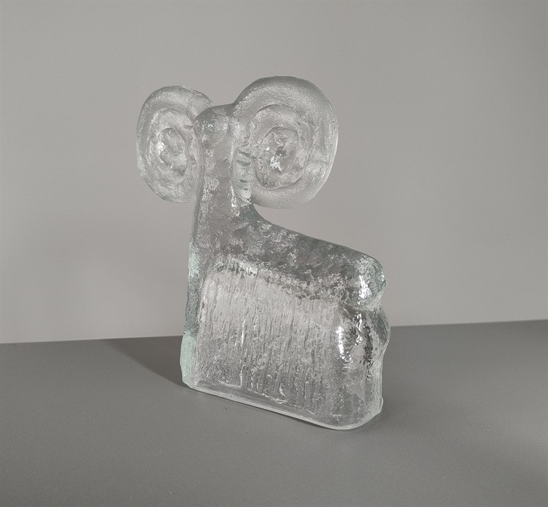 Jedna z trojice slavných postaviček z lisovaného skla, které navrhl Pavel Pánek v 70. letech pro Sklárnu Rudolfova huť. Tento kousek z lisovaného čirého skla (vzor 13290, výška 13,5 cm, rok 1971) představuje berana v typickém stylu českého designu té doby jednoduché, ale působivé linie a hravý charakter. Stav: Bez poškození Krásný sběratelský objekt pro milovníky českého uměleckého skla a retro designu 70. let.