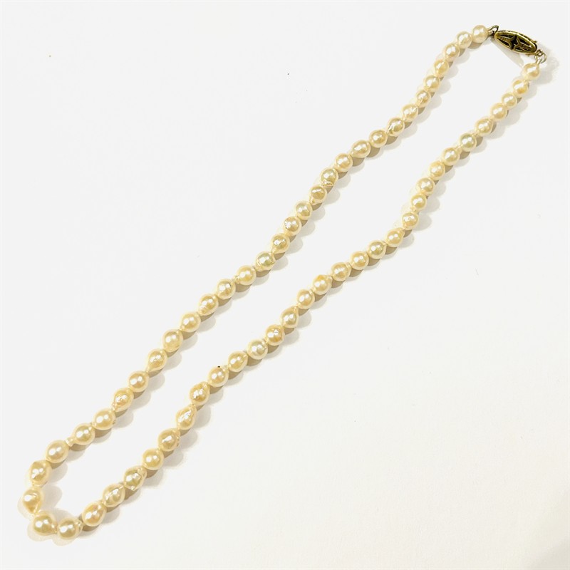 Velice elegantní náhrdelník se šňůry přírodních kultivovaných smetanově bílých perel, ty vynikají svým nedokonale kulatým organickým tvarem a průměrem okolo 6 mm. Oválné art-deco prolamované zapínání osazeno přírodní bílou perlou, frontální část z bílého, spodní ze žlutého zlata. Vkusný, tradiční šperk vhodný k dennímu nošení i večerní příležitosti, německá práce pforzheimského výrobce J. Köhle z 2. třetiny 20. století. Koncové kroužky zhotoveny ze 14 karátového zlata, tj. o ryzosti 585/1000, zapínání z 8 karátového, tj. o ryzosti 333/1000; nově opatřeno punc Z-59 (písmeno Z s alchymistickou růží) na háčku, ryzostní číslo a značka výrobce "JKa" zespoda zapínání. Hmotnost 21,60 g, délka 46 cm, zapínání 15 mm. Nově převlečeno, perly jsou mezi sebou pečlivě uzlíkovány. Zapínání v pořádku, celkově ve velmi zachovalém stavu.