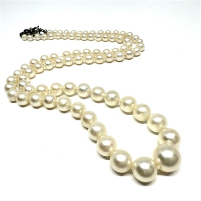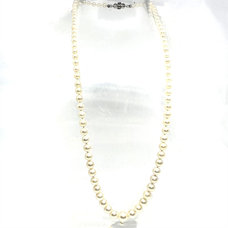 Elegantní, nadčasový náhrdelník. Šperk byl zhotoven ze souměrných, bílých perel jejichž velikost se směrem ke středu zvětšuje. Průměr 4 - 7 mm. Náhrdelník je zakončen dekorativním, stříbrným zapínáním osazeným rubíny. Stříbro ryzosti 925/1000. Celková váha šperku 18,86 g. Délka 51 cm. Výborný stav.