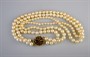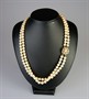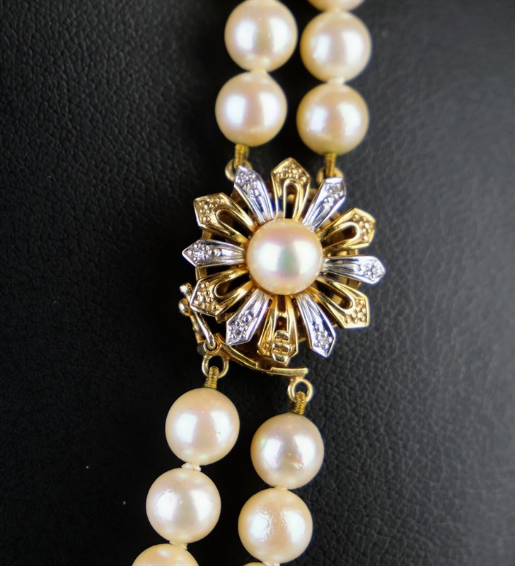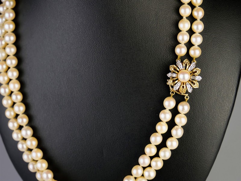 Dvouřadý perlový náhrdelník s dvoubarevným zdobným zlatým zapínáním květinového tvaru. 6 drobných diamantů briliantového brusu o velikosti 0,01 ct, celkem 0,06 ct. Celková hmotnost Au 43,36 g/585/1000, punc labuť (Z-58). Západní Evropa, třetí čtvrtina 20. století. Délka 42 cm, šířka 1,3 cm, průměr uzávěru 1,6 cm.