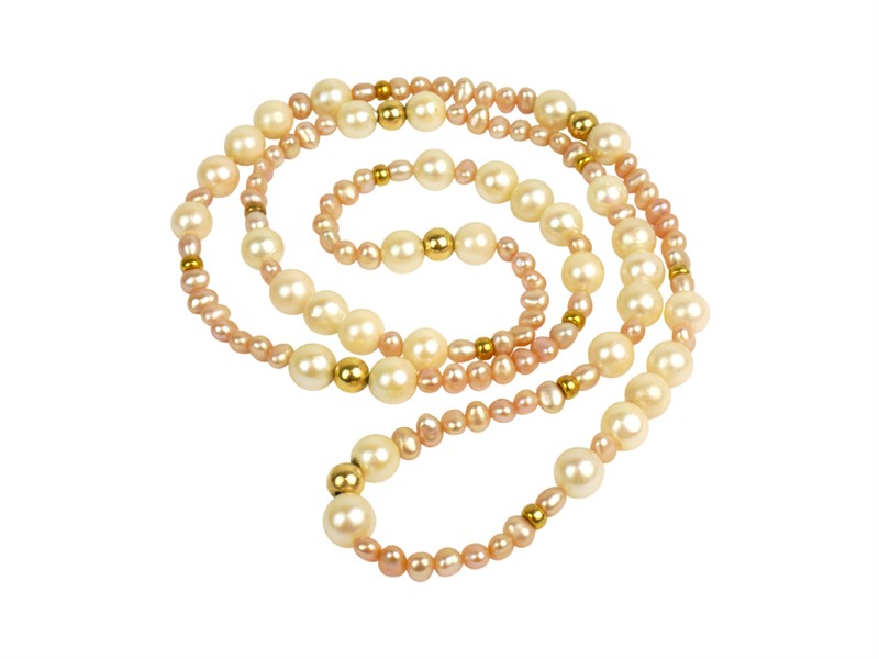 Náhrdelník ze sladkovodních perel prokládaný kuličkami ze zlata ryzosti 585/1000. Délka 71 cm. K dispozici osvědčení z puncovního úřadu.