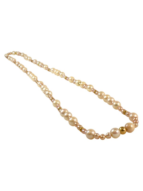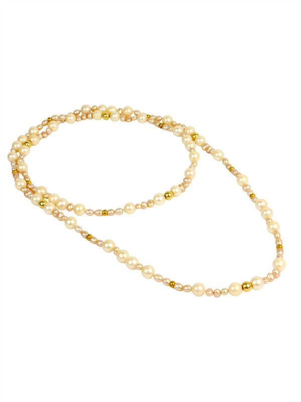 Náhrdelník ze sladkovodních perel prokládaný kuličkami ze zlata ryzosti 585/1000. Délka 91 cm. K dispozici osvědčení z puncovního úřadu.