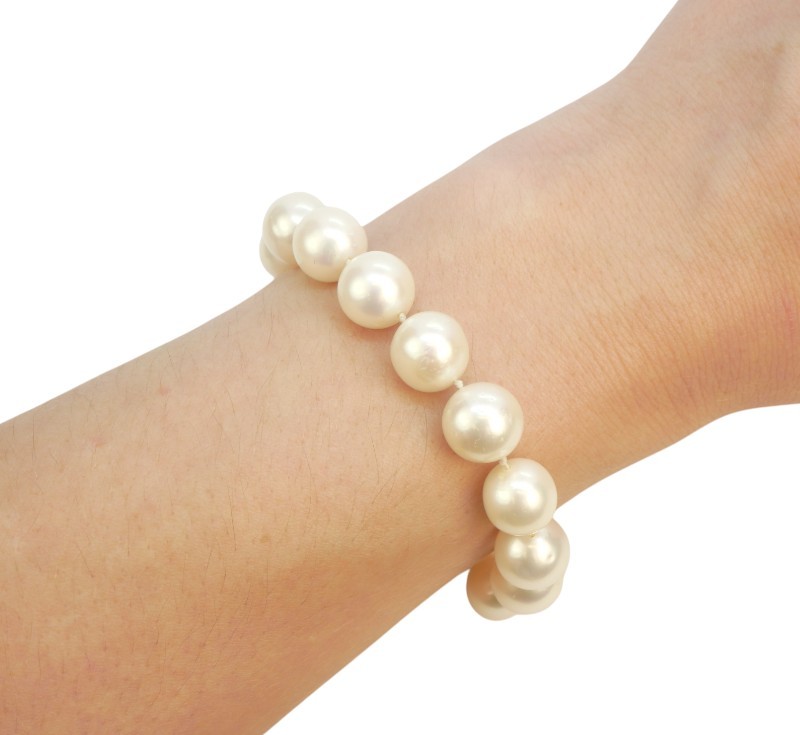 Náramek z kultivovaných mořských perel o průměru 10,5 mm se zlatým zapínáním v podobě hladké lesklé kuličky, tvarem korespondující se samotnými perlami. Uzávěr je vyroben ze zlata ryzosti 585/1000. Celková hmotnost náramku je 29,36 g. Délka náramku je 20 cm. Nově převlečeno, perly jsou mezi sebou pečlivě uzlíkovány.