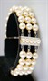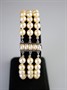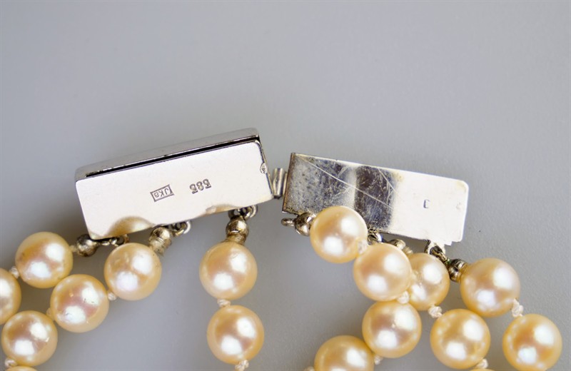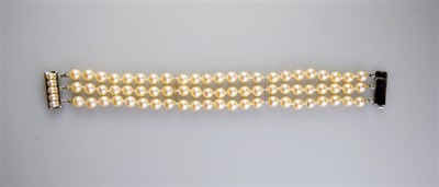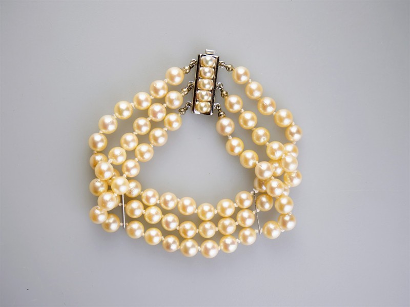 Třířadý perlový náramek se zapínáním a přepážkami z bílého zlata. Celková hmotnost Au 29,04 g/585/1000, punc labuť (Z-58). Západní Evropa, třetí čtvrtina 20. století. Délka 18 cm, šířka 2 cm, velikost uzávěru 2 x 0,8 cm.