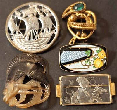 - Brož ptáček - se zeleným kamínkem, žlutý kov, sklo, 8 g, 4,5 x 3,5 cm, art deco, 20. léta m.s. pp Jablonec n N - Obdelníková brož s velkou hluboce rytou intaglií – dívka se srpem a obilím, žlutý kov, sklo, rozměr 5,5 x 2,7 cm, hmotnost 15 g, art deco, Turnov, 20. léta m.s. - Rybička závojnatka, rohovina, řezba v rohovině , hmotnost 7 g, rozměr 6 x 4,5 cm, art deco 20. léta m.s. - Smaltovaná brož s dvěma žlutými růžemi, smalt, žlutý kov, hmotnost 15 g rozměr 4,7 x 2,8 cm, art deco 20. léta m.s., Jablonec n N - Velká kulatá brož s plachetnicí, stříbřený OK, průměr průměr 5,5 cm, hmotnost 9g, art deco, 20. léta m.s. práce Státní odborné školy šperkařské v Turnově,