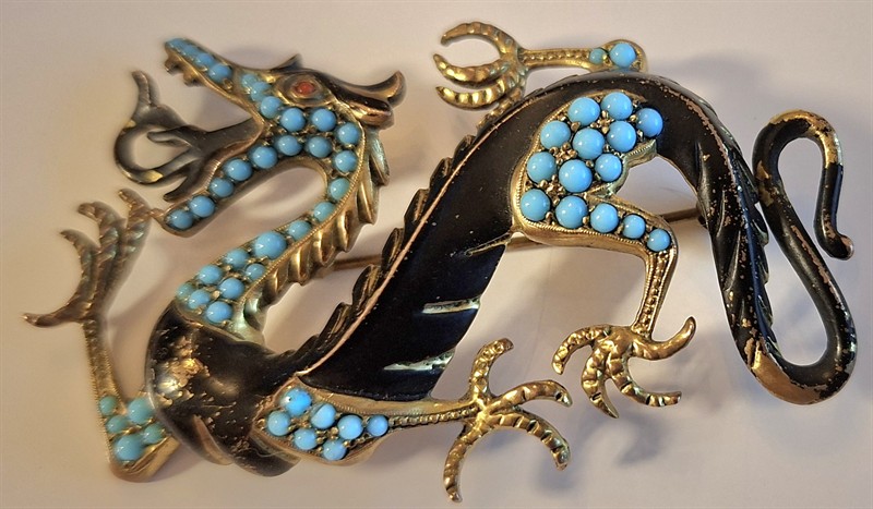 Drak ze žlutého kovu s černým smaltem vykládaný modrozelenými kaménky imitujícími tyrkys, tombak , sklo, 20. léta m.s. art deco, rozměr 6,5 x 4 cm, hmotnost 19 g, Vodní drak v japonském stylu, kombinovaná brož - tepaný stříbrný plech s jádrem z obeckého kovu, Turnovsko, značeno, 20. léta m.s. art deco, rozměr 3,8 x 6,5, hmotnost 20 g, Létající drak v čínském stylu, žlutý patinovaný kov, 20. léta m.s. art deco, rozměr 6 x 7,5 cm, hmotnost 24 g Svatý Jiří bojující s drakem, brož v barokním stylu, žlutý a bílý obecný kov, rozměr 6,5 x 5 cm, hmotnost 29 g, Čínský drak, art deco, bílý patinovaný kov, řezba z destičky bílého kovu, (nepuncováno), 20. léta m.s,, , 5,5 x 3,5 cm, hmotnost 9g