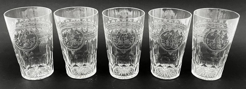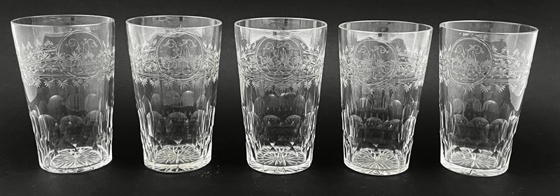 Čiré ručně broušené a ryté sklo. Pět elegantních ručně broušených a rytých skleniček z čirého skla. V medailonu ručně vyrytá písmena doplněná po obvodu skleniček broušenými čočkami a rytými florálními motivy. Na dně ručně broušená hvězdice. Střední Evropa 1870 - 1900. Výška 13 cm.