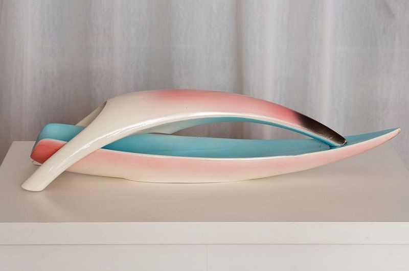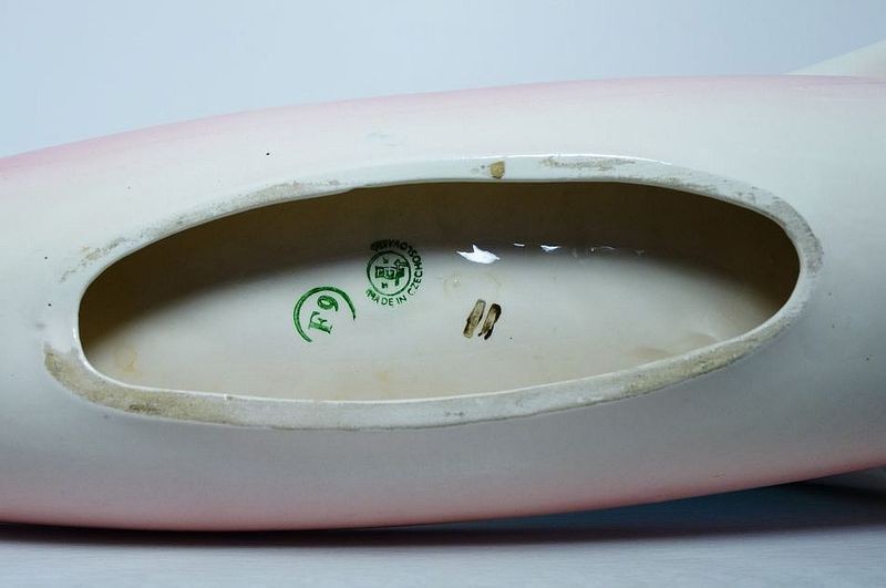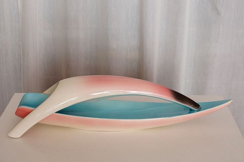 Větší dekorativní plastika organických tvarů, tvz. Bruselská keramika z Jílového, tak se nazývá tvorba manželů Bansetových - Slavoj BANSET (*1923 +1997) a Milena BANSETOVÁ Novotná (*1923 +2010), působili v letech 1958 až 1964 v keramičce Jílové u Děčína, značeno viz foto. Dobrý stav, rozměr - d. 55cm, š. 15cm, v. 13cm