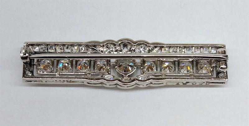 Přepychová art-deco brož z platiny a bílého zlata s diamanty briliantového brusu, celkem 2,44 ct , čistota VS1-VS2, barva G-H. Celková hmotnost 5,85 g, Pt + Au 950 + 750/1000, punc. Špičková klenotnická práce, Střední Evropa, 30. léta 20. století, délka 4,2 cm, šířka 1 cm.