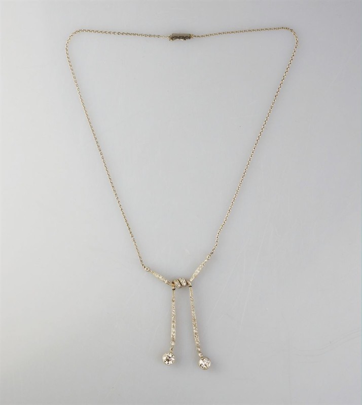 art deco platinový koliér s diamanty, efektní tvar zauzlované stuhy, Pt btto 9,36 g/900/000, celková hmotnost diamantů briliantového brusu je cca 1,6 ct, dva hlavní diamanty briliantového brusu o hmotnosti cca 0,5 + 0,5 ct, čistota SI3, barva I-J, střední Evropa, kolem r. 1925, délka řetízku 38 cm, závěs 5,5 x 3 cm; atest Puncovniho úřadu