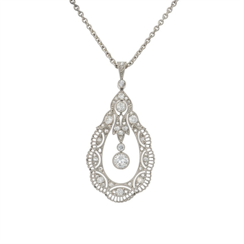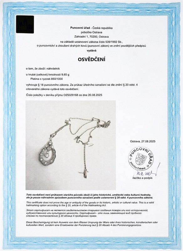 Platina o ryzosti 850/1000 váha celkem 9,65 g přírodní diamant Old Europe 1 ks 0,30 ct, bílý (G-H-I), čistota VS přírodní diamanty 9 ks 0,37 ct, bílý (G-H-I), čistota VS-SI1 (-SI2) téměř kulatá až nepravidelné routy 31 ks - 0,20 ct výška přívěsku 3,9 cm délka řetízku 45 cm výborný stav osvědčení puncovního úřadu certifikát z gemologické laboratoře je součástí šperku
