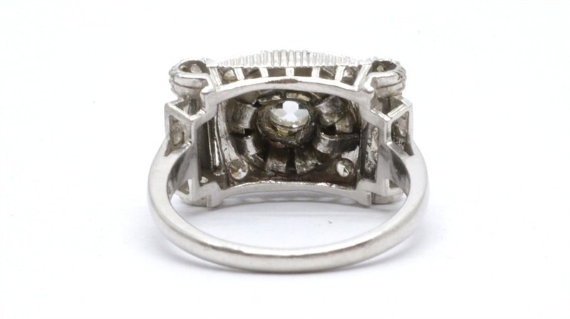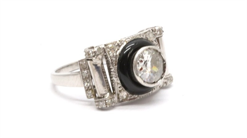 Platinový prsten s diamanty a onyxem Art Deco. Platina 950/1000, bílé zlato 750/1000, centrální diamant zasazen ve stříbře 870/1000. Přírodní onyx. Přírodní diamanty - starý brus, kvalita SI2 - I1, barva H - J, celková váha 0,93 ct (centrální diamant 0,69 ct, I1, I - J). Váha prstenu: 7,19 g. Velikost prstenu: 54. Osvědčení puncovního úřadu. K prstenu je vypracován znalecký posudek.