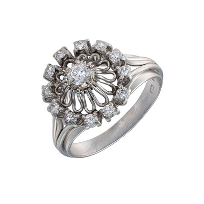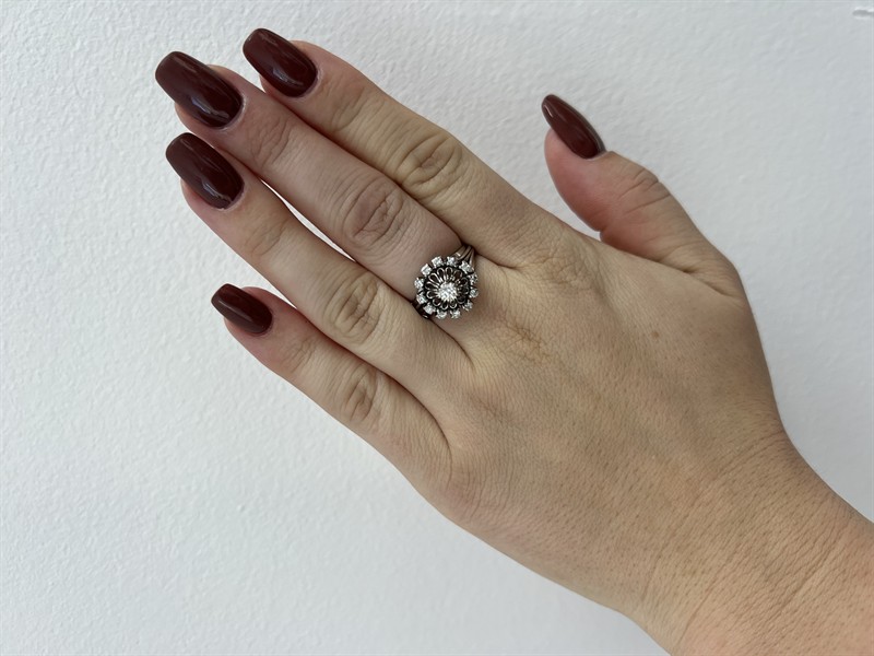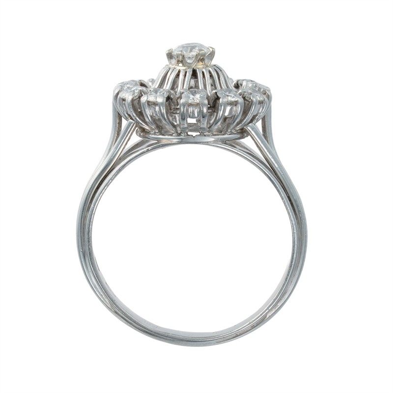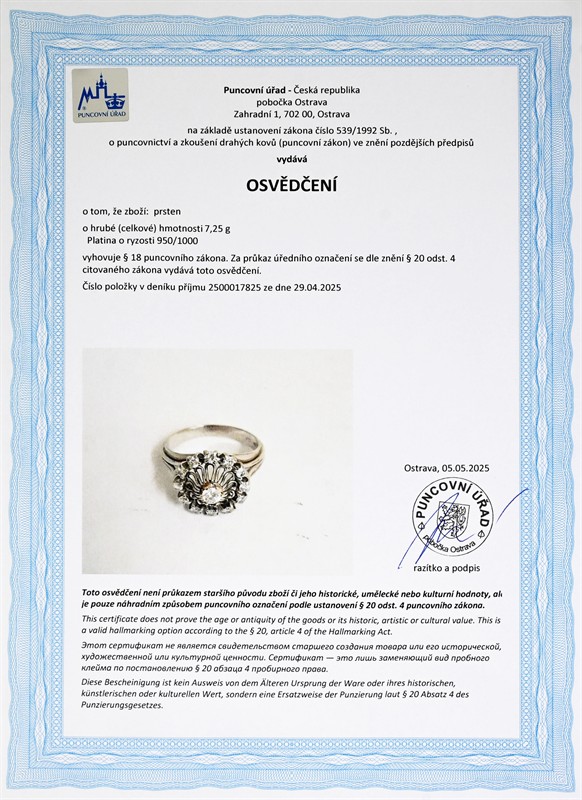 Platina o ryzosti 950/1000 váha 7,25 g přírodní diamant Old Europe 1 ks 0,18ct. vzácně bílý (F-G-H), čistota I1, průměr 3,55-3,6 mm přírodní diamant 12 ks 0,42 ct, vzácně bílý (F-G-H), čistota SI1-SI2, 3x I1-I2-I3, průměr 2,1-2,2 mm velikost 56,5 průměr hlavy 1,4 cm r. 1950 výborný stav osvědčení puncovního úřadu certifikát z gemologické laboratoře je součástí šperku