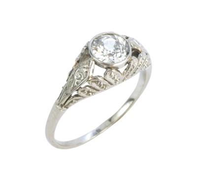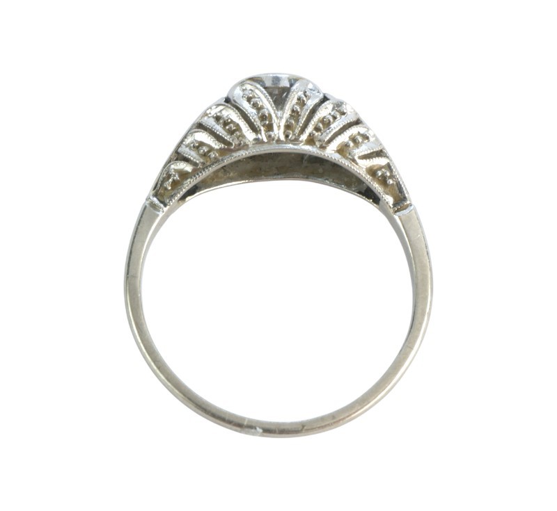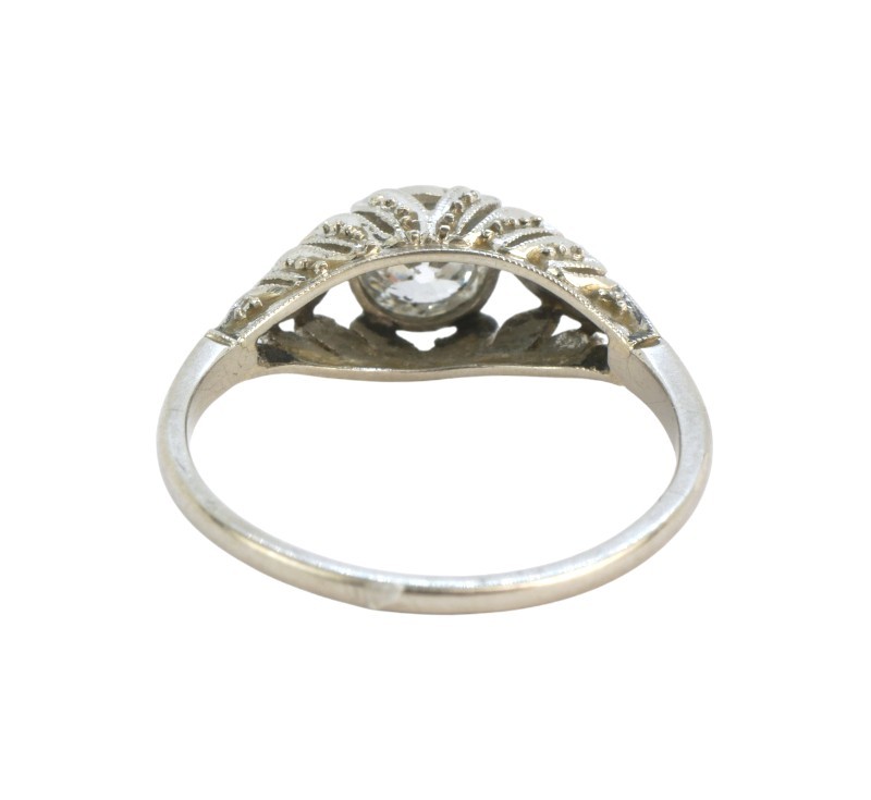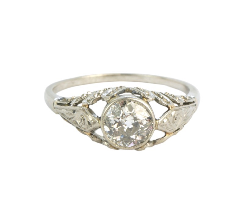 Starožitný platinový prsten osazený solitérním diamantem starého evropského briliantového brusu 0,70 ct, počátek 20. století. Platina o ryzosti 950/1000 o celkové hmotnosti 2,90 g, velikost prstenu 53. Atest Puncovního úřadu.