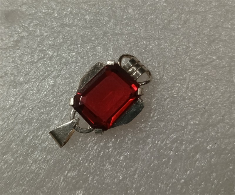 Art deco přívěsek vyrobený ze stříbra ryzosti 800/1000, s červeným broušeným kamenem . Délka3 cm , šířka 1,8 cm . Hmotnost 5,41 cm .