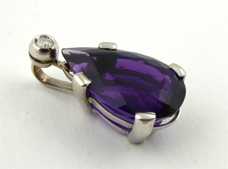 Osmnáctikarátové bílé zlato, přírodní ručně broušený velký ametyst, přírodní ručně broušený malý diamant. Ryzost Au 750/1000, celková hmotnost 3,9 g. Přívěsek z osmnáctikarátového bílého zlata s centrálním přírodním ametystem uprostřed ve tvaru kapky s oboustranným výbrusem doplněným v horní části přírodním diamantem o váze 0,05 ct, barva H, čistota SI. Značeno: československý punc kohout, ryzost 750, mistrovská značka. Itálie, třetí třetina minulého století. Rozměr přívěsku výška 20 mm, šířka 12 mm.