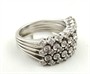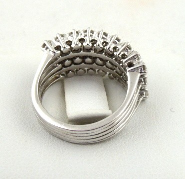 Bílé 18 karátové zlato, přírodní broušené diamanty. Ryzost Au 750/1000, celková hmotnost 9,50 gramů. Třiačtyřicet přírodních diamantů moderního briliantového brusu o váze 1,05 ct, barva H, čistota Si. Obroučka prstenu z bílého 18 karátového zlata tvořená pěti drátky navzájem dole spojenými. Hlava prstenu osázená dvěmi řadami s kulatými 16 přírodními diamanty moderního briliantového brusu o váze 0,25 ct a třemi řadami s 27 osazenými přírodními diamanty moderního briliantového brusu o váze 0,80 ct. Designový prsten. Značeno: nezřetelná mistrovská značka, československý punc hlava kohouta s číslem 3. Evropa, druhá polovina minulého století. Velikost prstenu 53.