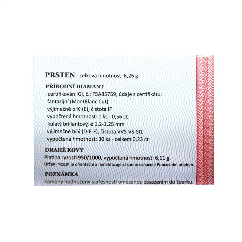 Platina 950/1000, celková hmotnost 6,26 g - certifikováno | Přírodní diamant fantazijní brus (Montblanc Cut) - vyjímečně bílý E/ čistota IF / 1 ks: 0,56 ct | Kulatý briliantový: -vyjímečně bílý D-E-F, čistota VVS-VS-SI1/ 30 ks: 0,23 ct - Diamanty celkem 0,79 ct | Výborný stav
