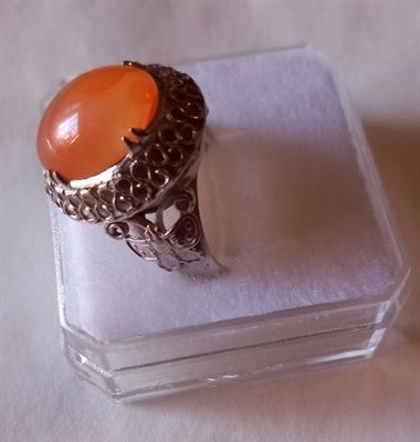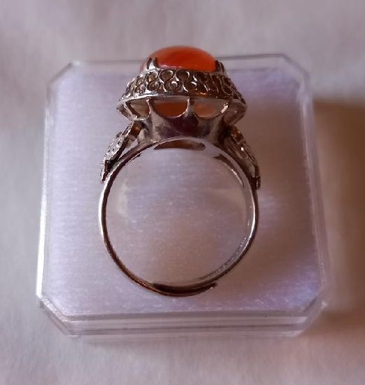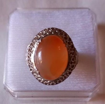 Prsten s karneolem je překrásně šperkařsky zpracovaný. Po stranách obroučky u koruny prstenu jsou malí motýlci. Prsten je puncovaný platným českým puncem pro stříbro 900/1000 dovozovou značkou. Váha prstenu je 7,80 gramů. Velikost prstenu je variabilní, obroučka není spojená, takže ji lze nastavit podle potřeby.Průměr karneolu v koruně prstenu je 1,5 cm. Průměr celé koruny je 2 cm.