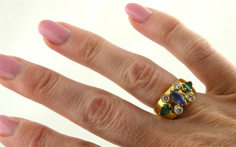 Osmnáctikarátové žluté zlato, přírodní smaragdy, přírodní safír a přírodní diamanty o celkové váze 0,45 ct. Ryzost Au 750/1000, celková hmotnost 6,93 g. Krásný designový prsten italské provenience se čtyřmi přírodními diamanty moderního briliantového brusu o celkové váze 0,45 ct, barva G, čistota SI2, dvěma přírodními smaragdy a jedním přírodním safírem. Prsten z osmnáctikarátového zlata s centrálním přírodním modrým safírem ručně broušeným do tvaru markýz, jehož po stranách doplňují dva přírodní zelené smaragdy výbrusu pendlok, okolo doplněné čtveřicí přírodních diamantů kulatého briliantového tvaru. Prsten se nalézá ve vynikajícím stavu. Značeno: československý punc kohout, ryzost 750 a značka klenotnického mistra. Itálie, třetí třetina minulého století. Velikost prstenu 54.