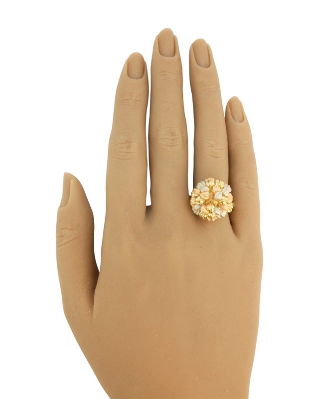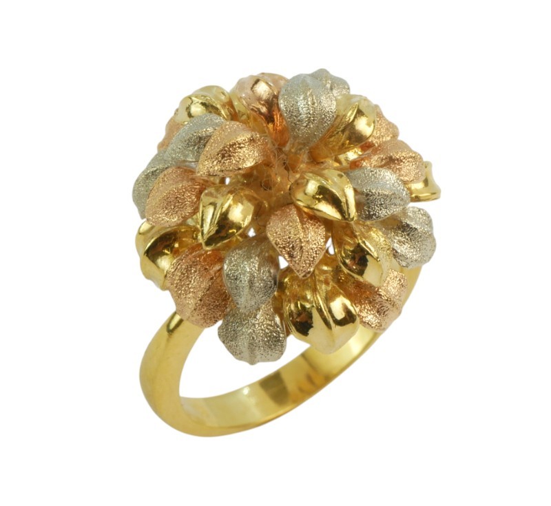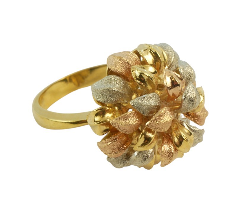 Originální prsten, jehož košatá hlava ve tvaru svazku lístečků (průměr cca 1,8 cm) je zhotovena ze zlata tří barev, ryzosti 750/1000. Velikost prstenu 56, celková hmotnost 10,30 g.