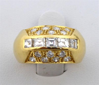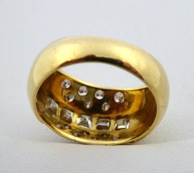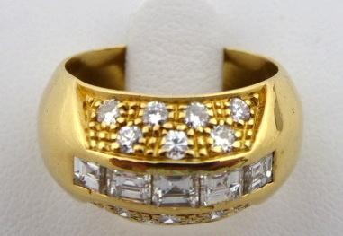 Prsten s diamantovými bagetami a brilianty,18 karátové žluté zlato, přírodní diamanty. Ryzost Au 750 / 1000, celková hmotnost 6,95 gramů. Pět přírodních  diamantových baget a čtrnáct přírodních diamantů moderního briliantového brusu o celkové hmotnosti 1 ct. Kroužek ze žlutého zlata klenutého tvaru. Na čelní straně uprostřed vsazených 5 přírodních broušených diamantových baget o hmotnosti 0,60 ct, barva E - F, čistota VS1 - 2. Okolo osázených ve čtyřech řadách 14 přírodních diamantů moderního briliantového brusu o hmotnosti 0,40 ct, barva F - G, čistota VS. Jedna bageta v rohu mírně poškozená, odštípnutá. Evropa druhá polovina minulého století. Značeno: nový český punc hlava kohouta. Velikost prstenu 52.