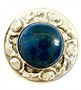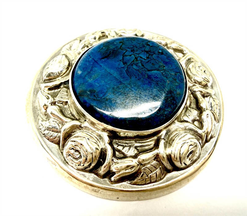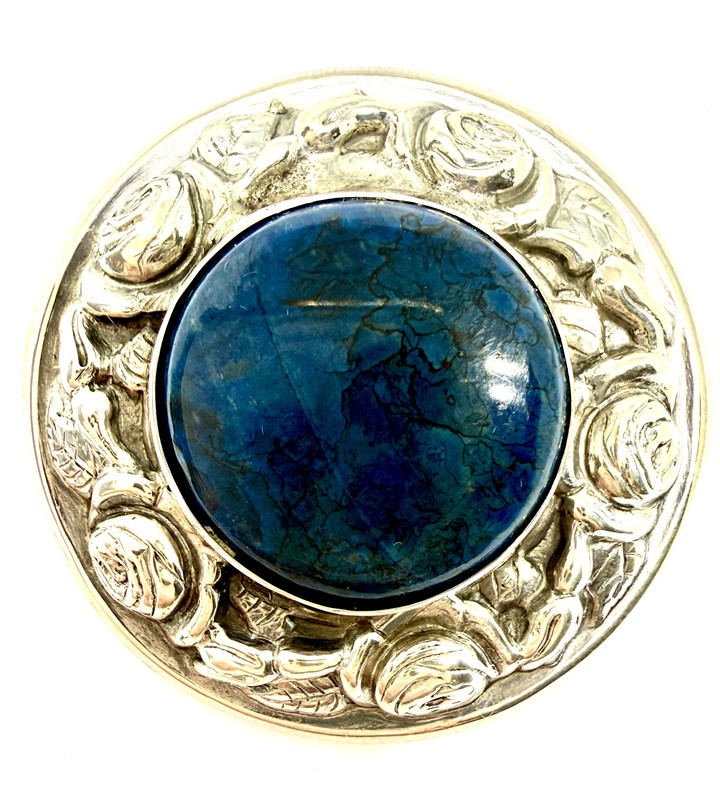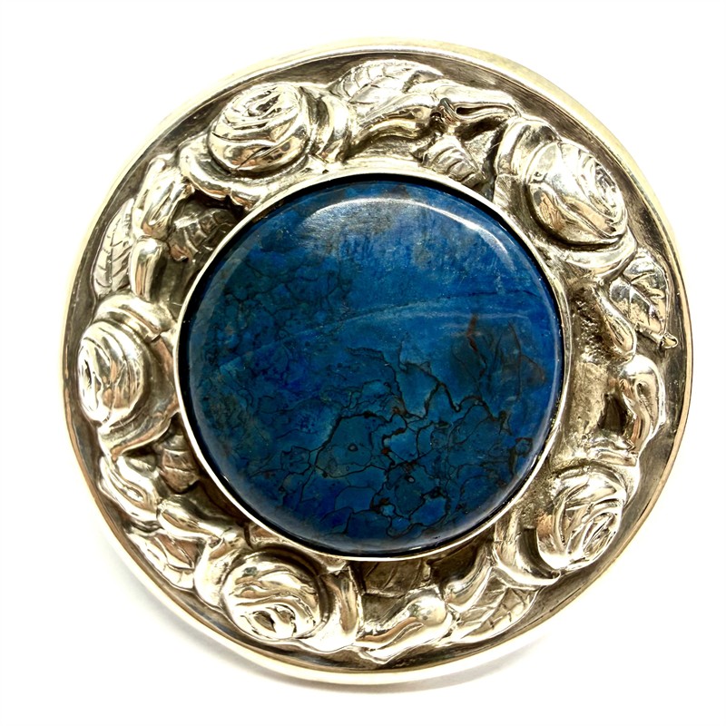 Elegantní, prvorepubliková brož ze stříbra. Šperk kruhového tvaru zdobí modrý, netrasparentní kámen hladkého brusu zarámovaný plastickým dekorem růží. Šperk byl zhotoven v první polovině 20.století ze stříbra ryzosti 800/1000. Jehla obecný kov. Celková váha 11,43 g. Průměr 4 cm. Perfektní stav.