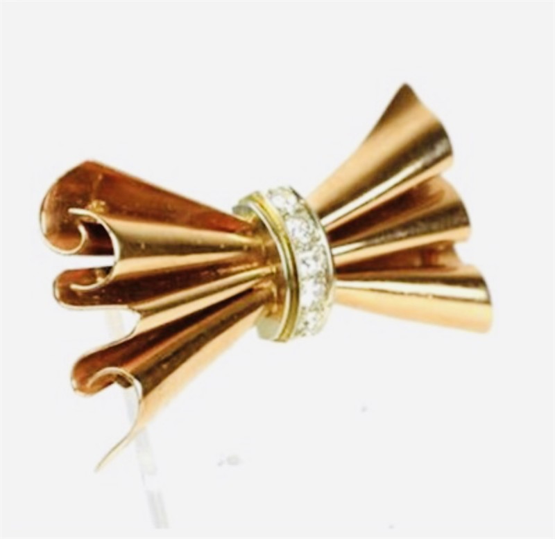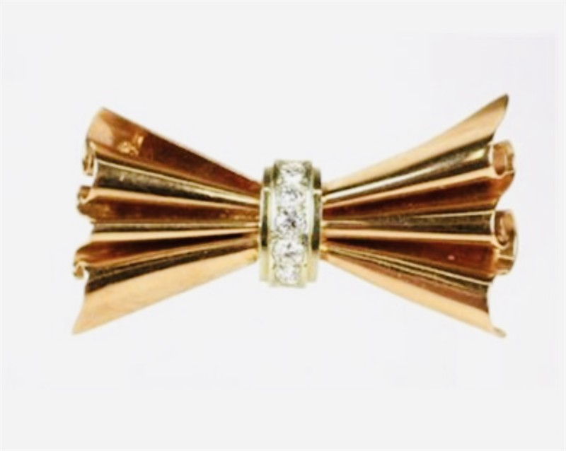 Starožitná prvorepubliková Zlatá brož s pěti brilianty ve tvaru mašle, 30. léta 20. století. Zlato ryzosti 585/1000. 5 kusu briliantů o celkové hmotnosti 0,30 ct, barva G, čistota VS. Celková hmotnost brože: 9,55 g. Rozměr: 4,5 x 2,4 cm. Velmi reprezentativní , odborně vyčištěna zlatníkem