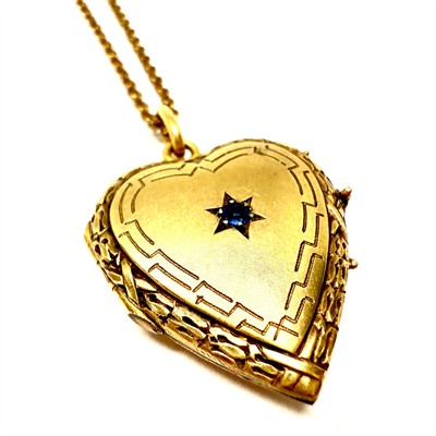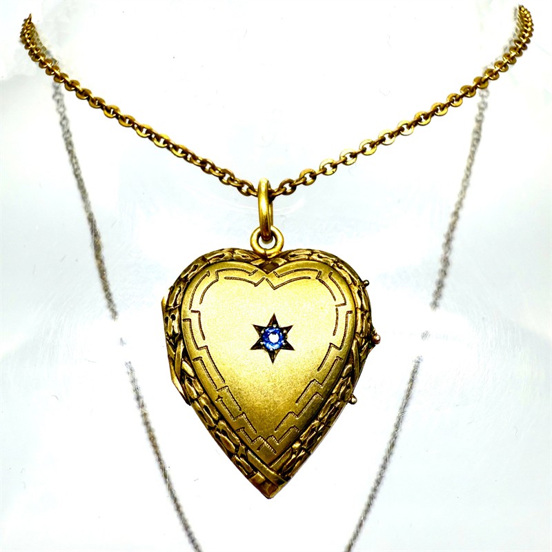 Půvabný náhrdelník zhotovený z double (silně zlaceného kovu) v období první republiky. Šperk zdobí jemný, odnímatelný medailon ve tvaru srdce. Závěs zdobí temně modrý kámen zasazený do hvězdy na středu. Délka řetízku 52 cm. Perfektní stav.