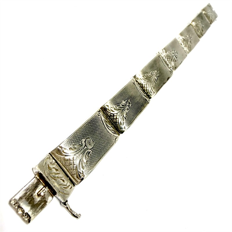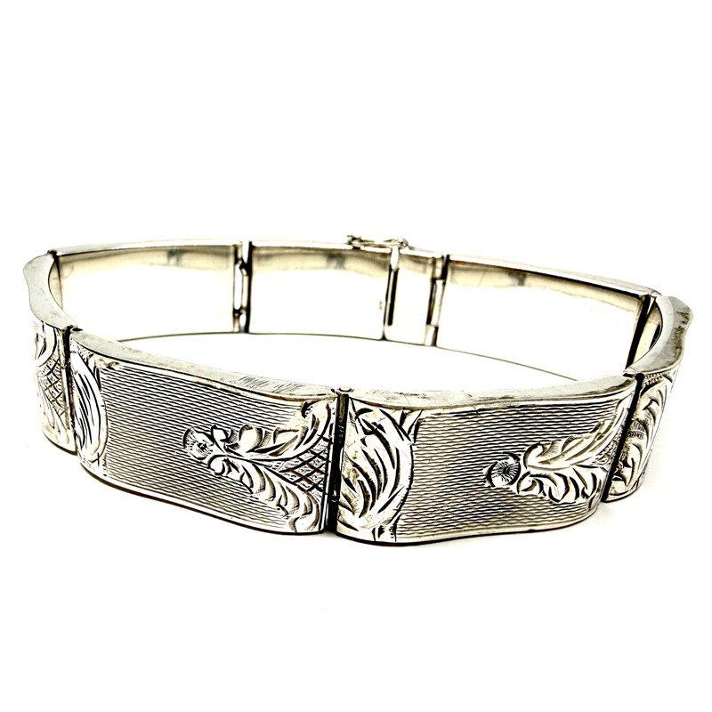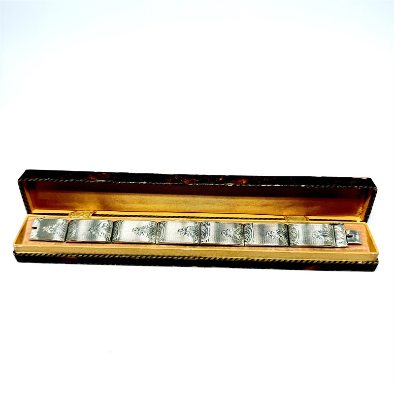 Půvabný, článkový, stříbrný náramek z období první republiky. Šperk byl zhotoven ze stříbra ryzosti 800/1000, o celkové váze 24,20 g. Jednotlivé články zdobeny ručním rytím a jemným gilošováním. Značeno dobovou puncovní, ryzostní a mistrovskou značkou. Délka cca 19 cm, šířka 1,5 cm. Součástí prodeje je původní, dobová etuje. Výborný stav.