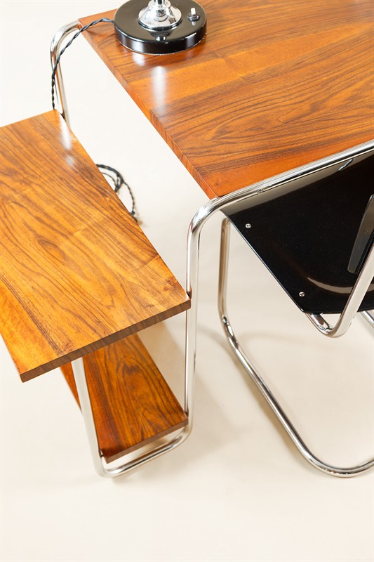 PSACÍ STŮL GOTTWALD Slohové období-Funkcionalismus Datování-30.léta 20.století Původ-Čechy Materiál-dřevěný korpus, ořechová dýha, trubková ocel Rozměry-v76 š145 h60 Stav-restaurováno, redesignováno Poznámka-TOP IKONA ELEGANCE Cena stůl-92000 kč Cena židle-15500 kč Cena lampa-13500 kč Doručení-zajistíme po dohodě