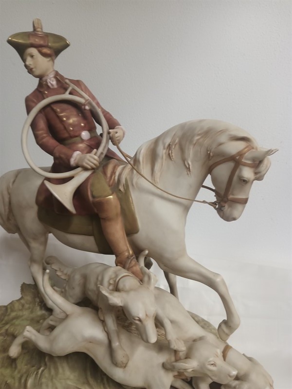 Velké sousoší z porcelánu - lovec na koni , se psy. Sousoší značeno Royal Dux . Výška 47 cm .